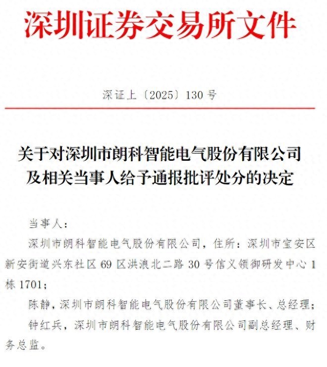 发布日期:2025-03-09 01:39 点击次数:1652月20日,深交所发布纪律处分决定书,对深圳市朗科智能电气股份有限公司(以下简称“朗科智能”)及相关责任人因擅自变更募集资金用途、未履行信息披露义务等违规行为给予通报批评。